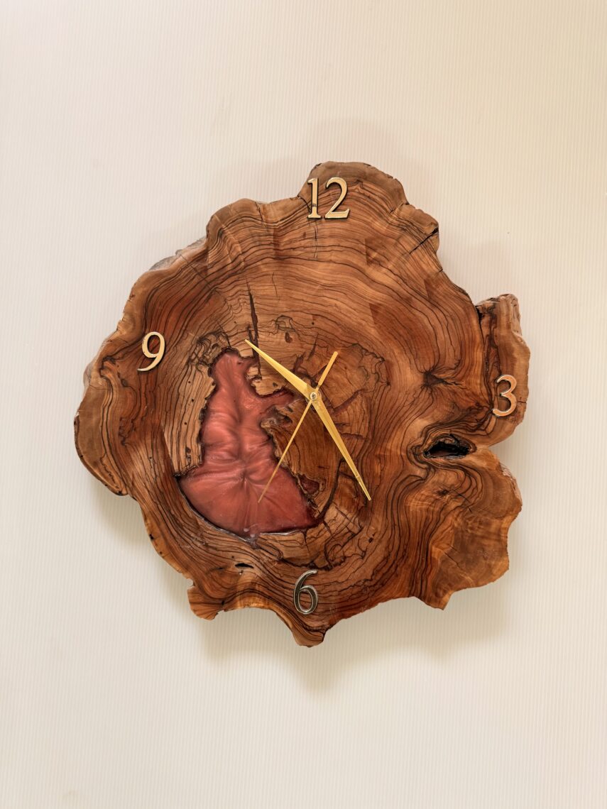 שעון בעבודת יד בעיצוב ייחודי, עשוי אפוקסי בגוון אדום עם עץ זית טבעי – שילוב מושלם של מסורת, אומנות ויוקרה.